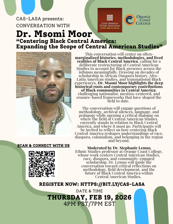 Continuamos con nuestro ciclo de pláticas con diversas personas especializadas en la región, la gente y/o la diáspora de Centroamérica. Nuestro segundo evento está programado para el jueves, 19 de febrero, con el Dr. Msomi Moor en "Centering Black Central America: Expanding the Scope of Central American Studies" con Dra. Stephanie Lemus.