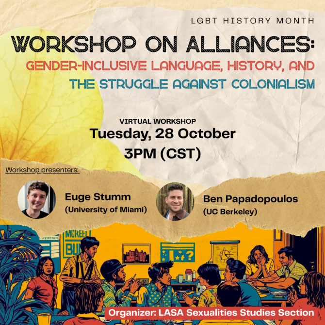 As part of the new board's and chair's goals for this section, and in light of the importance of LGBT History Month, we are pleased to present the first in what we hope will be a long series of events promoted and organised by the Sexuality Studies Section of the Latin American Studies Association. This workshop about non-binary language and the struggle against colonialism is made possible by the awesome collaboration of Euge Stumm and Ben Papadopoulos. We are pleased to share the following information with all our members: